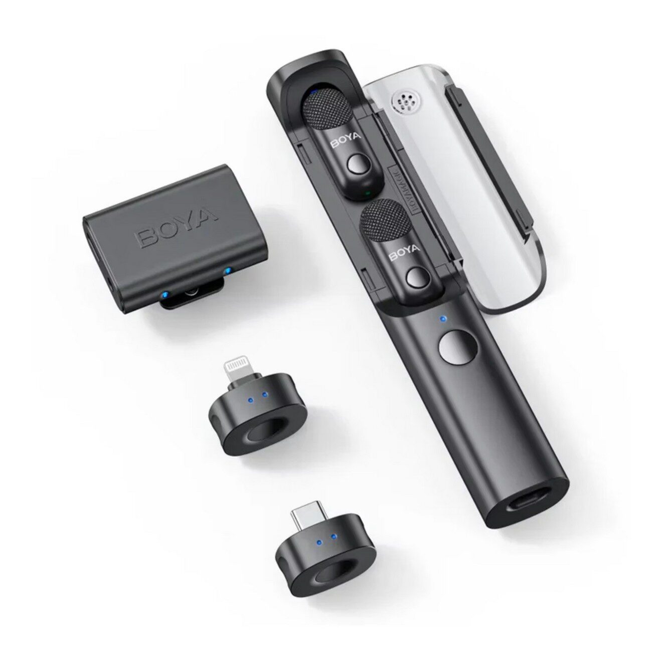 Wireless mic-kit: 2 TX + USB-C/Lightning/3.5 mm RX, AI-ruisonderdrukking en 30u batterijduur.