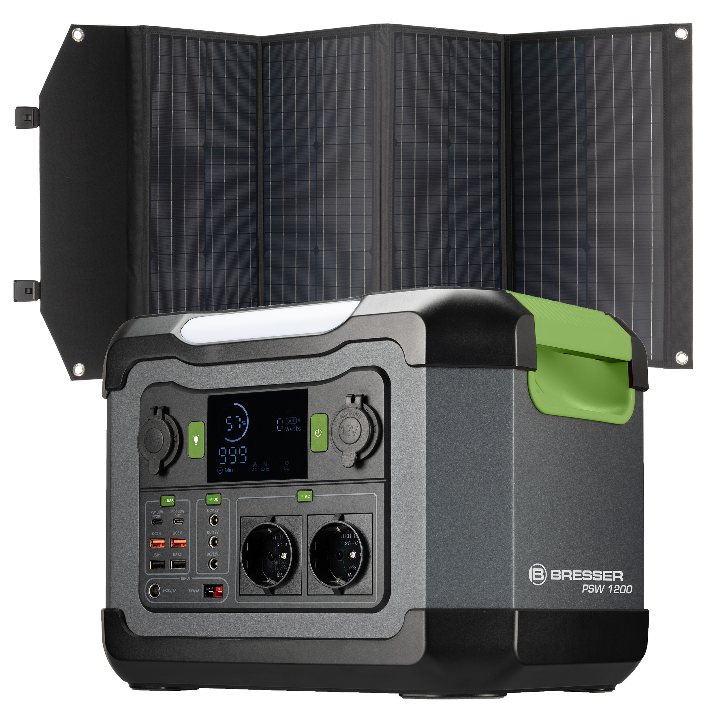 Met de BRESSER Powerstation kunt u  tot 6 USB-mobiele apparaten zoals telefoons, MP3-spelers, mobiele gameconsoles, camera’s, drones, enz. tegelijkertijd opladen. Hiervoor biedt het apparaat  2 x USB-A  en  USB-C-poorten  evenals  2 x USB-A snellader-uitgang  met Qualcomm Quick Charge 3.0-ondersteuning. U kunt ook tot 5 x 12 volt apparaten van stroom voorzien met een totaal opgenomen vermogen van 10 ampère. U gebruikt 2 directe auto-sigarettenaanstekers-aansluitcontacten en 3 x DC 2,1/5,5 mm aansluitcontacten. Met de 2 meegeleverde adapters van 5,5/2,1 mm holle stekker naar sigarettenaansteker-aansluiting kunt u auto-/campingapparaten zoals koelboxen, waterpompen, minicompressoren, luchtpompen enz. rechtstreeks en parallel aansluiten. Bovendien zijn 2 stopcontacten met 230 volt en in totaal 1.200 watt continu vermogen beschikbaar op het apparaat. Ideaal voor het aansluiten van opladers voor notebooks/tablets/smartphones, mobiele koelboxen, muziekinstrumenten enz. of andere elektrische apparatuur in deze vermogensklasse.
