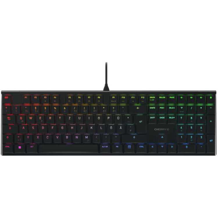 Het CHERRY MX 10.0N RGB-toetsenbord levert een indrukwekkend bewijs van hoe plat een premium mechanisch toetsenbord kan zijn. Dit wordt mogelijk gemaakt door middel van CHERRY MX LOW PROFILE RGB SPEED-schakelaars, die uitsluitend in Duitsland worden geproduceerd. De totale hoogte van het USB-toetsenbord is slechts 22 mm. Hierdoor typ je ergonomisch en comfortabel, zelfs zonder polssteun. Hoewel het elegant slank is, springt de solide metalen constructie meteen in het oog. Zelfs de uitklapbare voet is volledig van aluminium. Als bijzonderheid klapt deze voet automatisch naar binnen zodra je het toetsenbord optilt. Het toetsenbord staat stabiel op het bureaublad en glijdt niet weg, ongeacht of de voet omhoog staat of niet. Elke toets bevat een RGB-LED met maximaal 16,8 miljoen kleuren. Naast voorgeprogrammeerde effecten kun je ook je eigen kleuren kiezen of individuele toetsen verlichten. Je hebt de keuze tussen levendige kleureffecten of discrete eenkleurige verlichting. CHERRY MX LOW PROFILE RGB SPEED-schakelaars zijn bestand tegen meer dan 100 miljoen indrukken per toets. Ondanks het lage profiel voel je bij elke toetsaanslag direct het onnavolgbare MX-gevoel. De schakelkarakteristiek is lineair, d.w.z. zonder klikken en zonder merkbare weerstand. Het schakelpunt treedt in werking na een bediening van slechts één millimeter. Het is niet nodig om de toets helemaal naar beneden te duwen. Dit verhoogt niet alleen de reactietijd, maar zorgt er ook voor dat elke toetsaanslag wordt geregistreerd. Een enorm voordeel en niet alleen voor gamers. Door de robuuste constructie, grote duurzaamheid en instelbare verlichting is de MX 10.0N RGB niet alleen geschikt voor gamers en computerliefhebbers, maar ook voor industriële toepassingen. Het compacte toetsenbord voelt zich overal thuis en is een echte allrounder!