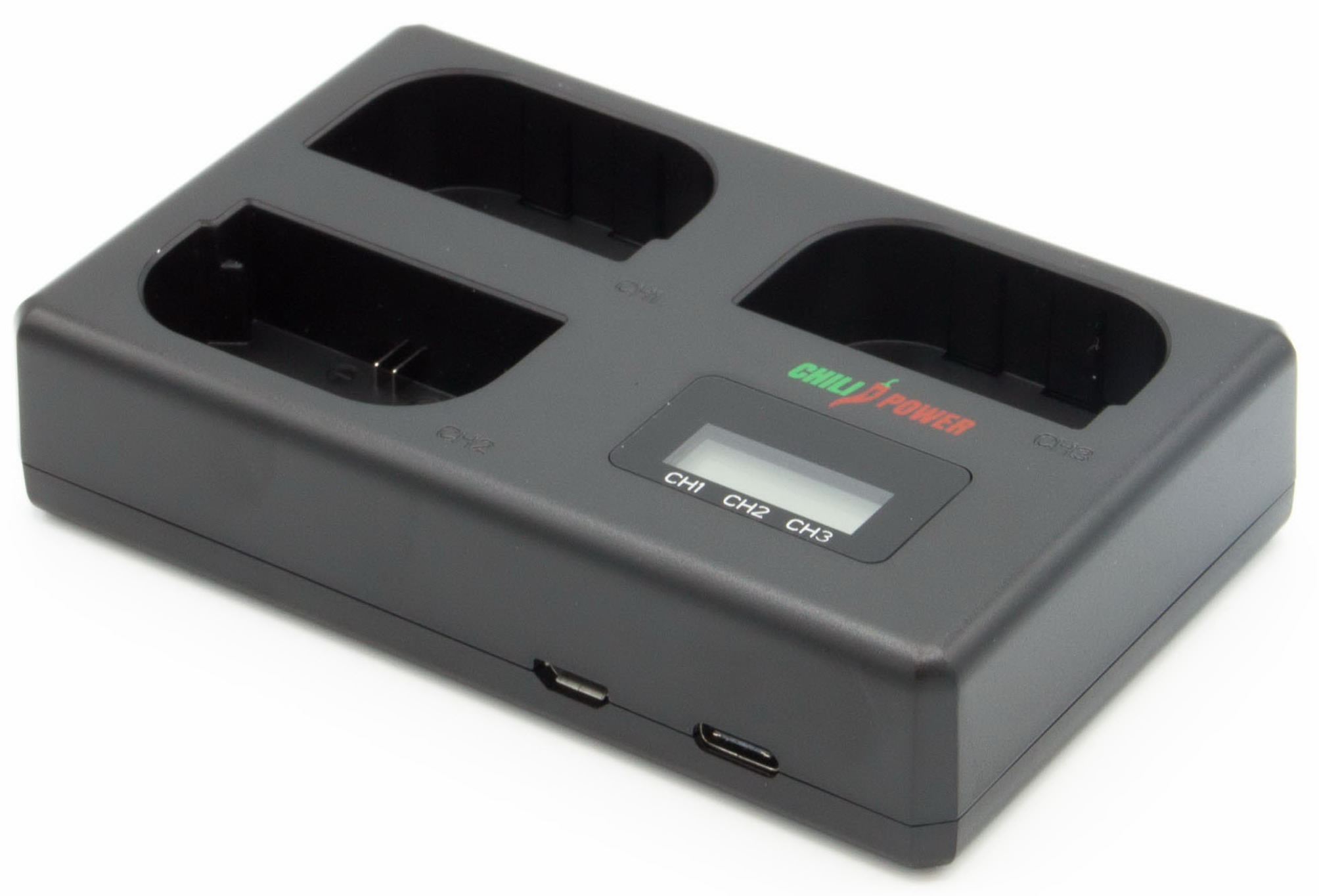 Kleine en platte oplader voor het opladen van 3 accu’s LP-E6/LP-E6N/LP-E6NH. Per stuk of allemaal tegelijk. Aan te sluiten op een powerbank, autolader, USB poort of lichtnet. Voorzien van LCD die per accu de laadstatus aangeeft.