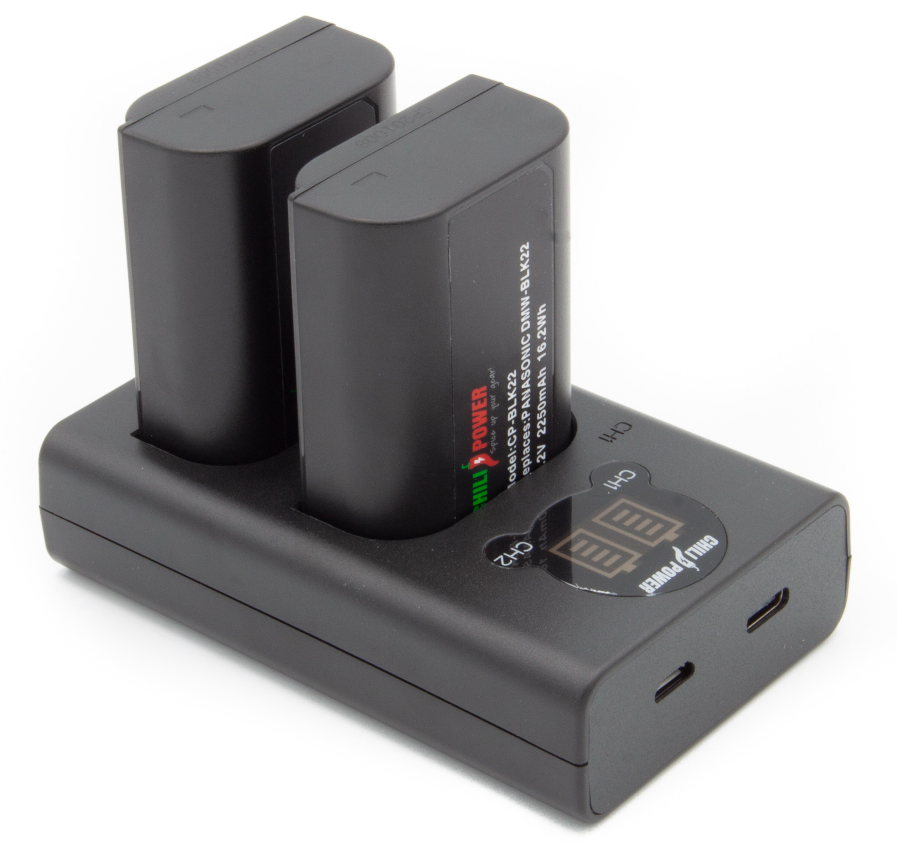 Voordeelset, bestaande uit 2 ChiliPower DMW-BLK22 Panasonic accu’s (2250mAh) en een compacte USB dubbellader. Inclusief USB kabel. Aan te sluiten op een powerbank, autolader, USB poort of lichtnet.