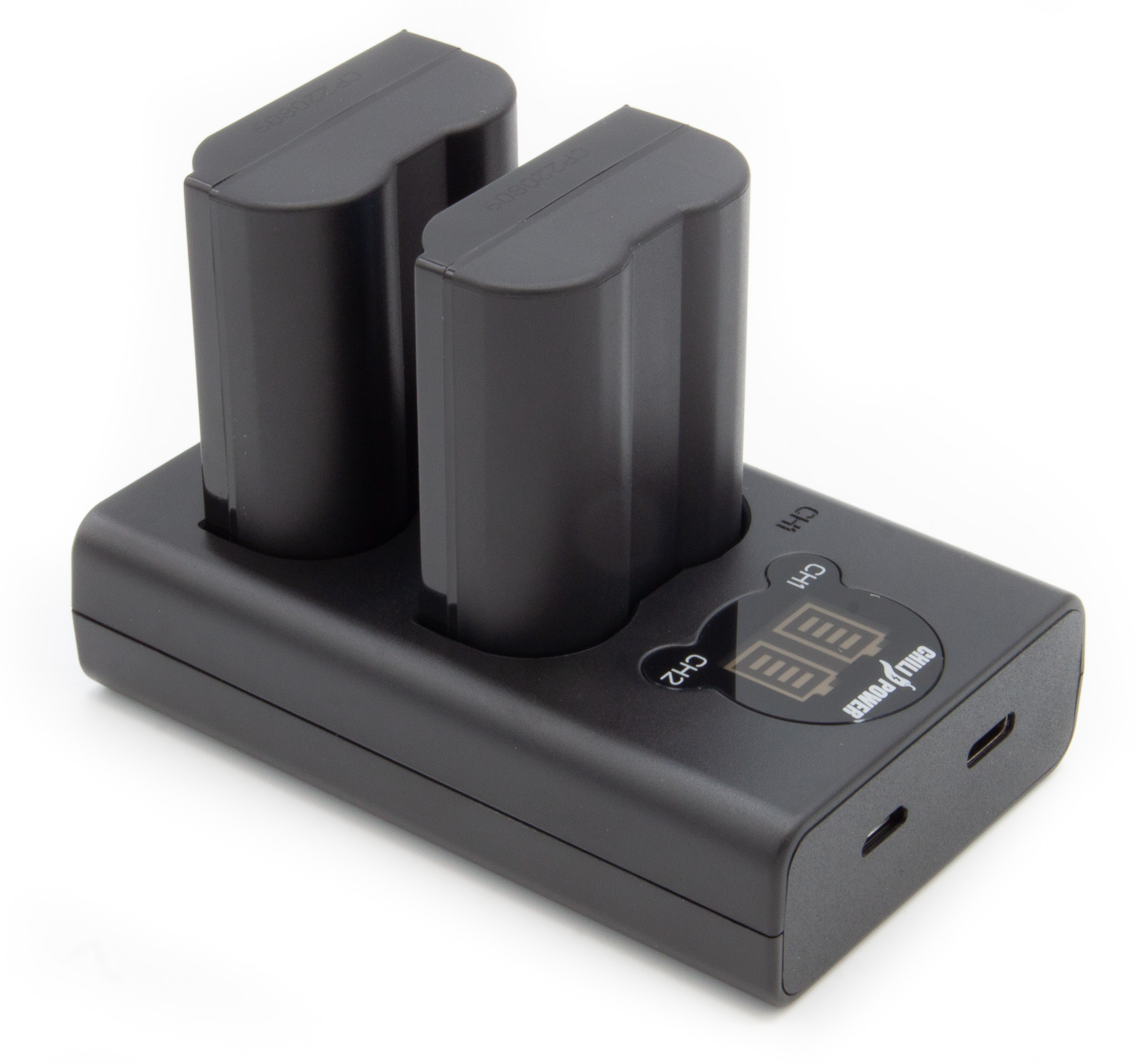 Voordeelset, bestaande uit 2 ChiliPower EN-EL15c Nikon accu’s (2280mAh) en een compacte USB dubbellader. Inclusief USB kabel. Aan te sluiten op een powerbank, autolader, USB poort of lichtnet.