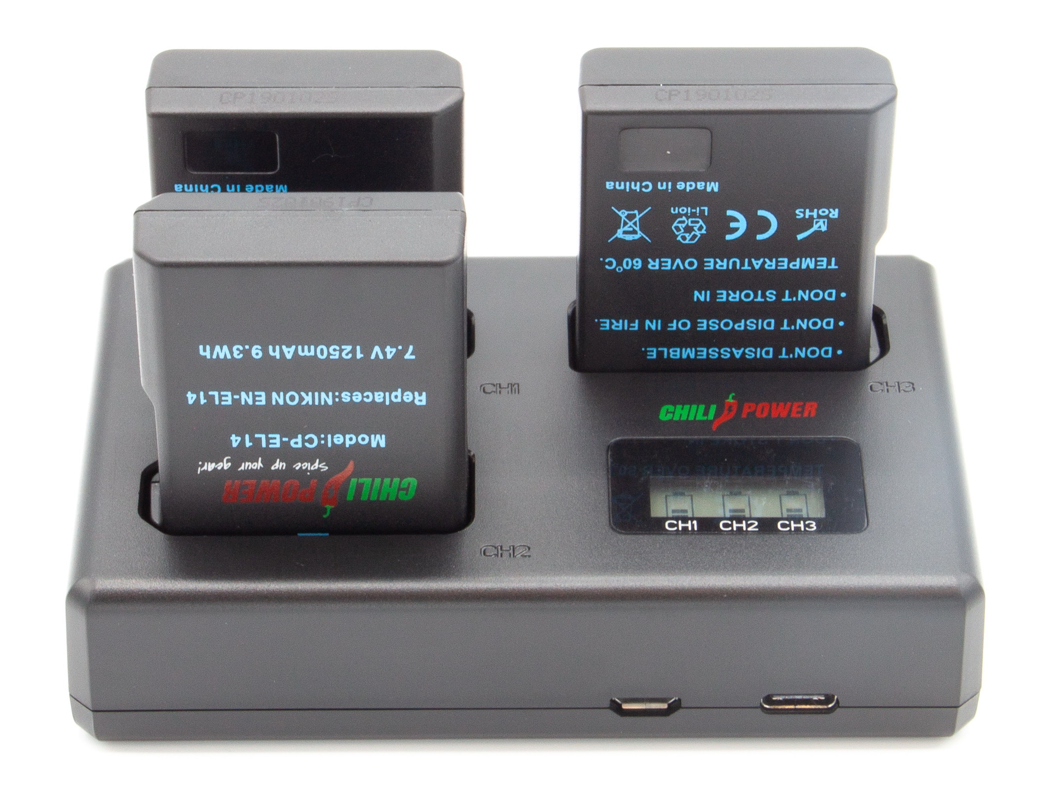 Ideale Accu set voor Nikon. Bestaande uit 3 accu’s EN-EL14 en een Triple oplader, geschikt voor het laden van 3 accu’s (per stuk of tegelijk). Aan te sluiten op een powerbank, autolader USB poort of lichtnetadapter. Capaciteit accu’s: 1250mAh.