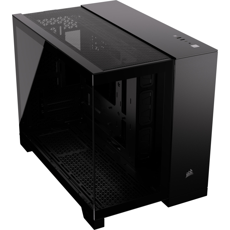 De zwarte Corsair 2500X Micro ATX Dual Chamber pc-behuizing biedt een opgeruimd en overzichtelijk zicht op je SFF pc door de dubbele voorpanelen van gehard glas. Geniet van een rommelvrije look met een speciale kamer voor kabels, harde schijven en controllers. Het kleine formaat van de 2500X verbergt veel opties voor je met ruimte voor maximaal negen 120 mm of vier 140 mm fans en veelzijdige montageposities voor radiatoren aan de bovenkant, op de bodem en aan de zijkant. Compatibiliteit met moederborden met een omgekeerde aansluiting geeft je een kabelvrij zicht op je systeem. Eenvoudige harde schijfbevestigingen zonder gereedschap bieden plaats aan twee 3,5″ of twee 2,5″ harde schijven of SSD’s, terwijl een modern I/O frontpaneel, inclusief USB-C 3.2 Gen 2, gemakkelijke toegang biedt tot apparaten. De 2500X is gebouwd met het oog op eenvoud en een reeks aanpassingsopties zorgt ervoor dat de 2500X je SFF pc er op zijn best uitziet en optimaal presteert.