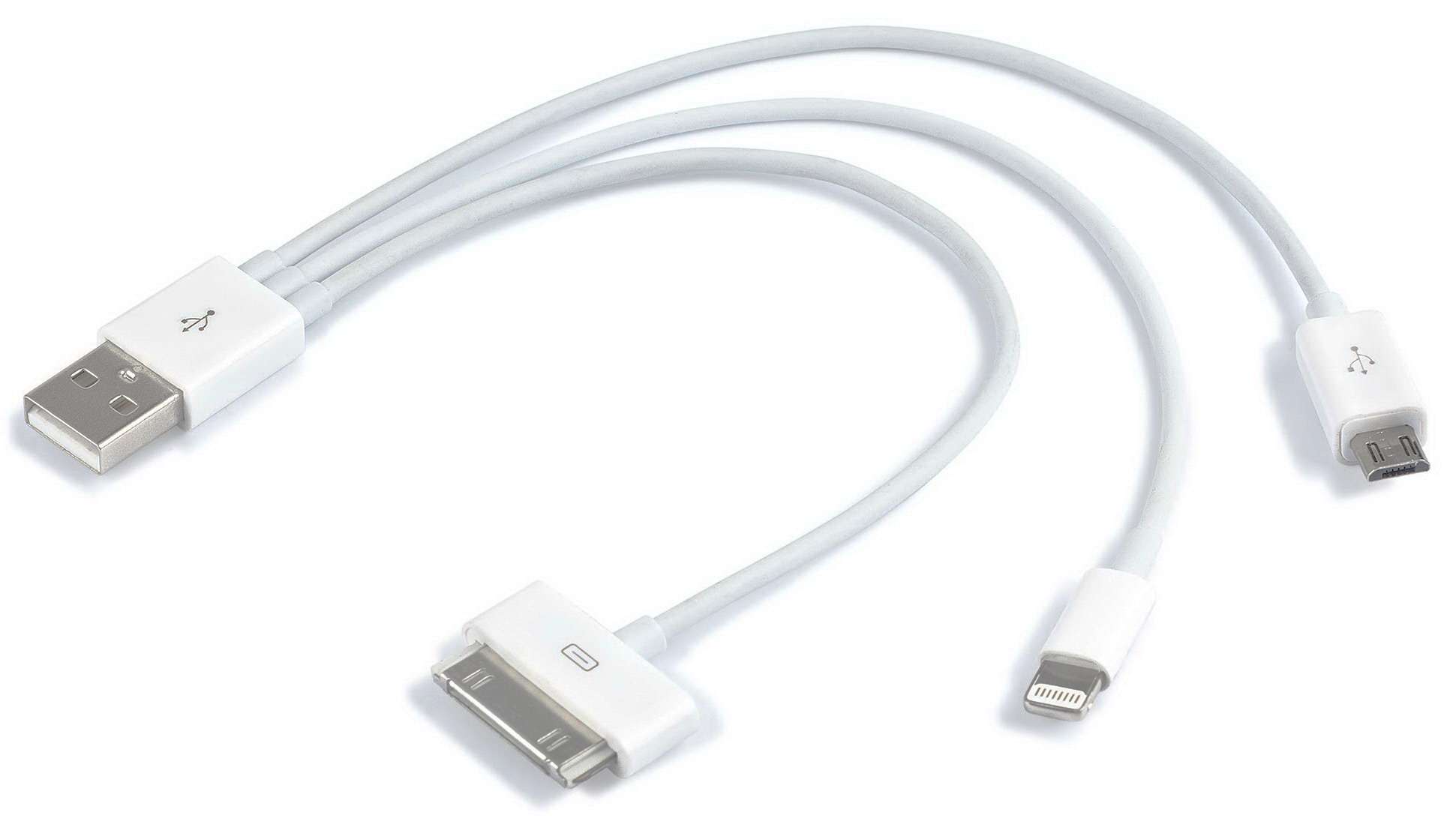 Handige 3 in 1 kabel, bijvoorbeeld voor gebruik op een powerbank. Van USB naar Apple 30 pins, Apple 8 pins (Lightning) en microUSB.