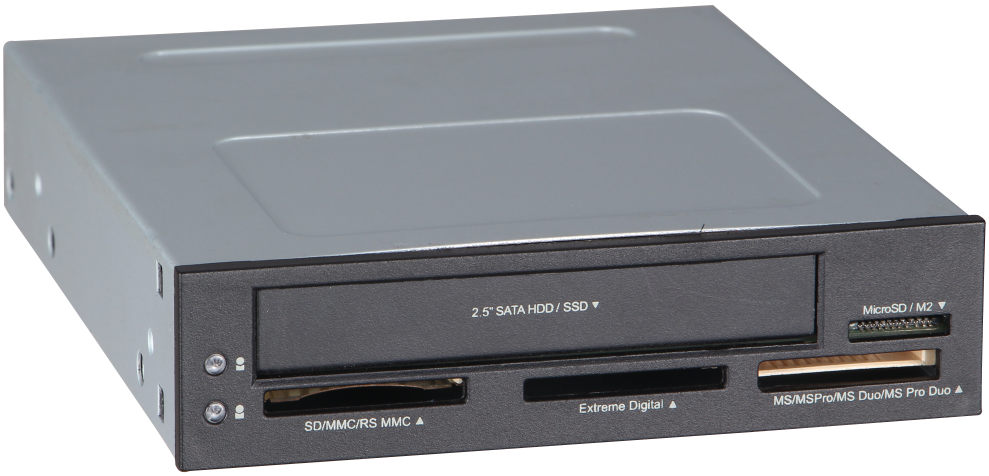 Kenmerken:Interne multi-card reader / writerGeen drivers nodig van WindowsOok geschikt om een 2.5'' HDD/SSD op het front paneel aan te sluitenSpecificaties:Fits in 3.5' drive bay of desktop PCSD/MMC/RS-MMC socket (supporting SDHC and SDXC also): Secure Digital Card, Mini Secure Digital Card, Multimedia Card, Multimedia II Card, Reduced-Size Multimedia Card, Ultra II Secure Digital Card, Extreme Secure Digital Card, Extreme III Secure Digital Card, T-flashMS socket: Memory Stick Card, Memory Stick Pro Card, Memory Stick Duo Card, Memory Stick, Pro Duo Card, MagicGate Memory Stick Card, MagicGate Memory Stick Duo Card, MagicGate Memory Stick Pro Card, MagicGate Memory Stick Pro Duo Card, Extreme III Memory Stick Pro Card, Ultra II Memory Stick Pro Card, High-speed Memory Stick CardMicroSD socketCards capacity support: up to 32 GB2.5'' HDD/SSD drive bay with internal SATA port, up to 3 GbpsSingle plugged card accessNet weight: 0.23 kgDimensions: 120 x 100 x 25 mmSystemeisen:Windows 7/8/10Free motherboard USB IDC9 and SATA port