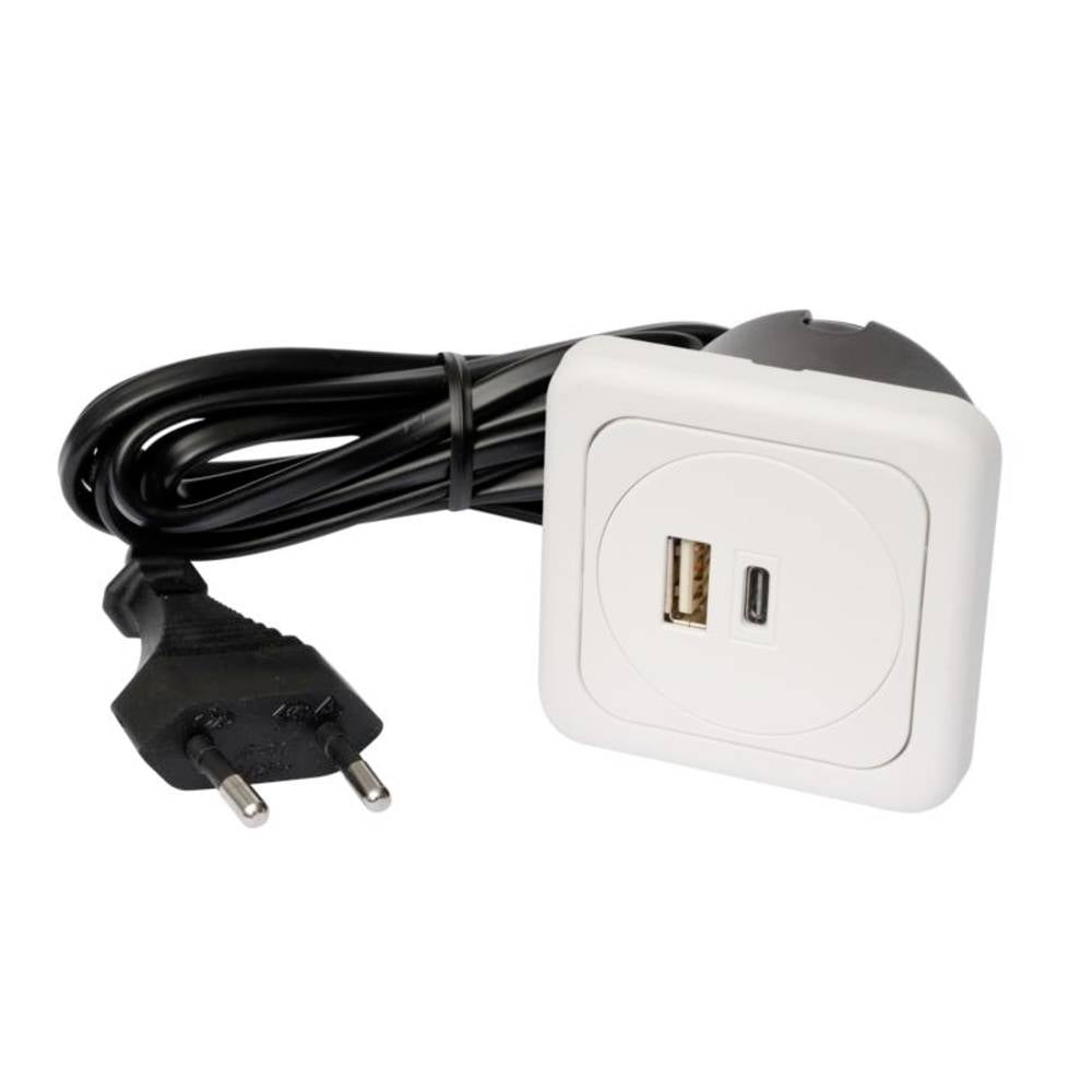 Dubbele USB-A/C laadcontactdoos voor het opladen van smartphones, tablets, powerbanken en mobiele eindapparaten. De eenheid is met een aanraakbeschermkap naar achteren beveiligd en met een 2 m…