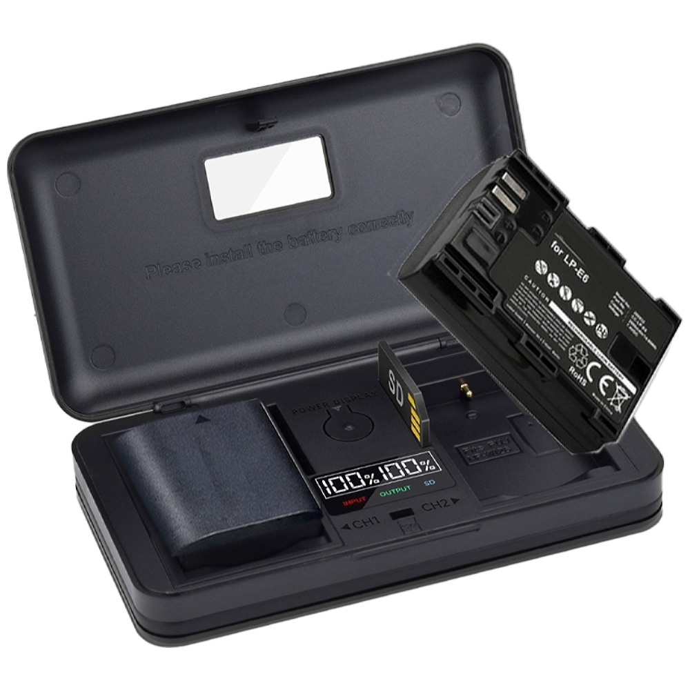 Duocharger voor gelijktijdig laden van twee accu’s LP-E6NH via USB kabel. LCD schermpje voor aanduiding laadpercentage van beide accu’s. Lader heeft als extra 2x SD Card Reader poorten.