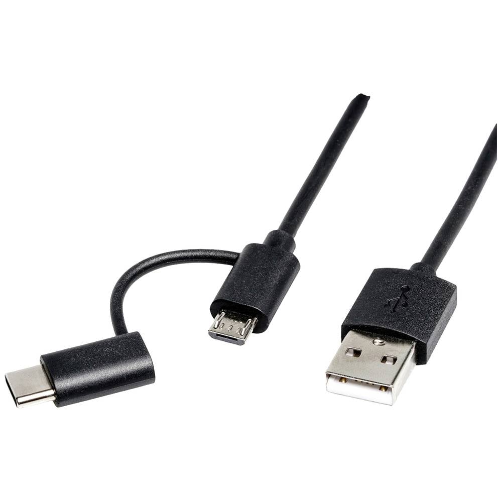 Veelzijdig inzetbare USB 2.0-kabel met 2-in-1-stekker de ene kant van de kabel is uitgerust met een micro-USB B-stekker, alternatief door een opzetstuk met een type C-stekker, de andere kant heeft een…