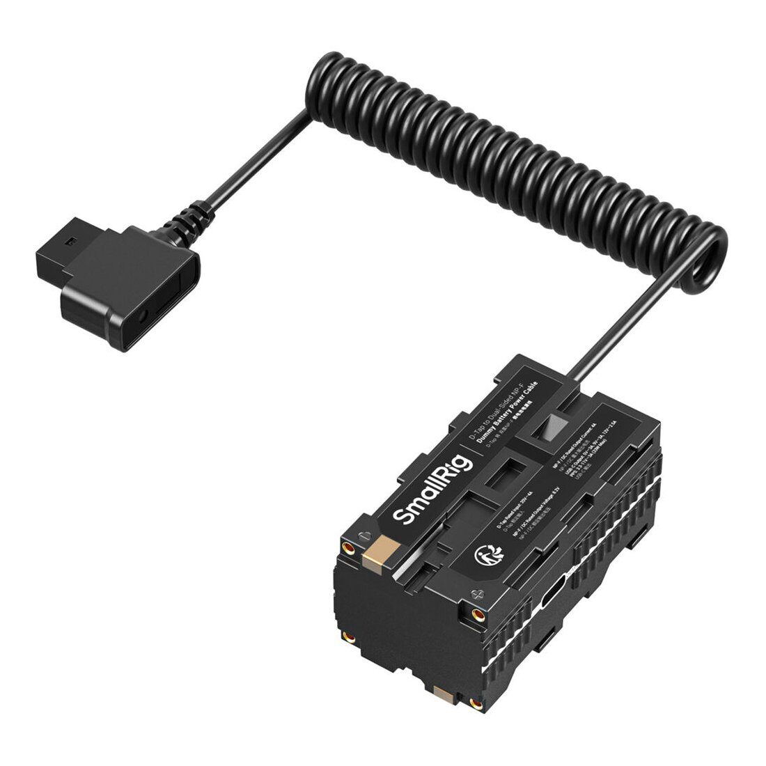 Multikabel met D-Tap ingang en vier uitgangen (NP-F, DC, USB-C) voor efficiënte stroomvoorziening op de set