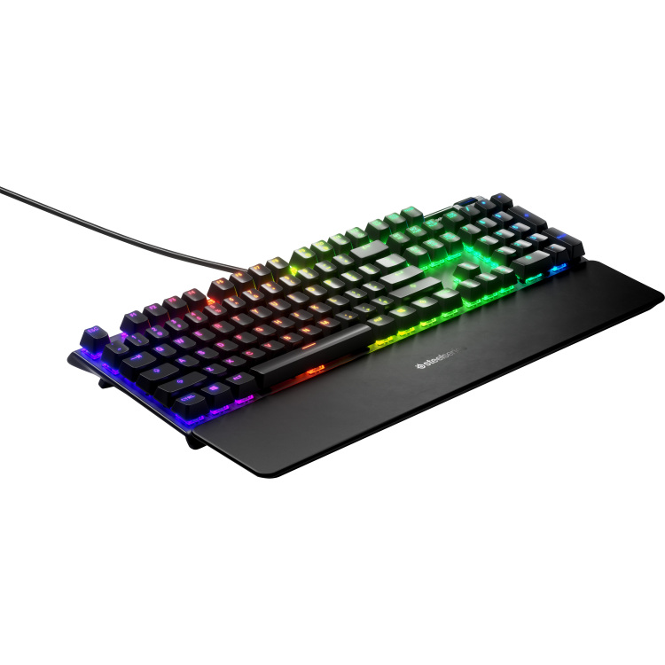 Het SteelSeries Apex Pro gaming toetsenbord combineert verbluffende lichteffecten, relevante in-game meldingen en SteelSeries OmniPoint mechanische switches in een robuust Series 5000 gelegeerd aluminium frame. Het geïntegreerde OLED Smart Display levert direct informatie uit games en apps. De RGB-verlichting wordt voor elke knop afzonderlijk geleverd en kan worden gesynchroniseerd met andere SteelSeries spelapparatuur. De mechanische OmniPoint-switches bieden een instelbare triggerbeweging van 0,4 tot 3,6 millimeter, waardoor ze perfect kunnen worden aangepast aan elke situatie en individuele behoeften. N-key rollover en 100% anti-ghosting zorgen voor bliksemsnelle reacties in het spel en de uitneembare magnetische polssteun zorgt voor het nodige comfort tijdens lange gamesessies. Apex Pro heeft niet alleen drie kabelkanalen geïntegreerd in het frame voor maximale orde op het bureau, maar heeft ook een USB doorvoerpoort voor het aansluiten van een flash drive, muis, headset of smartphone. Alle instellingen kunnen worden opgeslagen in het ingebouwde geheugen van Apex Pro met vijf profielen en het volume, de helderheid en de geluidsregeling kunnen on-the-fly worden aangepast door middel van multimediabesturing.