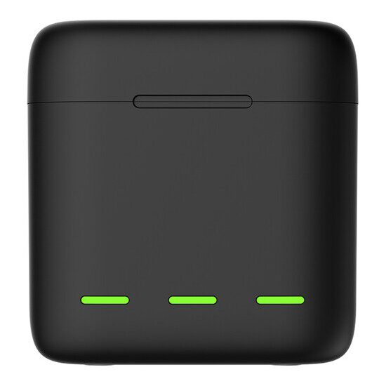 Oplader voor GoPro Hero 13 accu’s, met ruimte voor 3 accu’s en SD-kaarten, USB-C voeding.
