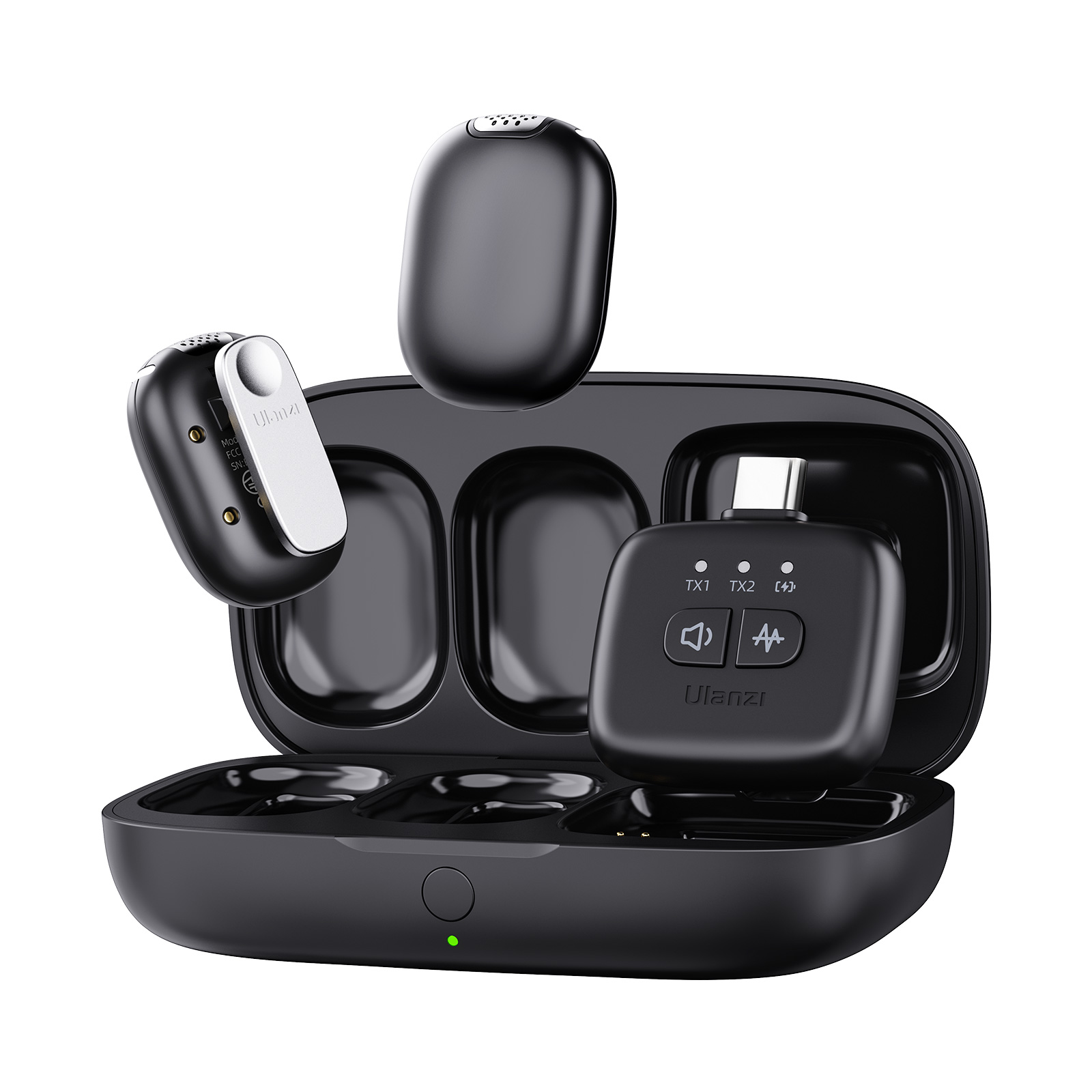 Zeer kleine draadloze microfoon-set voor smartphone en camera met USB-C, Lightning en 3.5mm-adapter.
