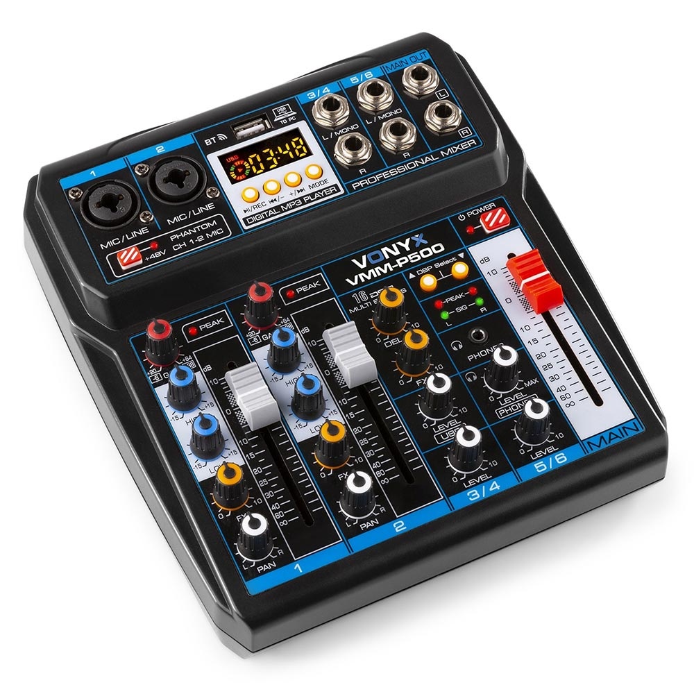 De Vonyx VMM-P500 is een mixer, mediaspeler en audio interface inéén. Het kleine apparaat heeft vier kanalen, DSP-effecten en is via usb direct aan te sluiten op je computer. Daarnaast kun je er ook nog mp3’s mee afspelen en via bluetooth audio naar strea