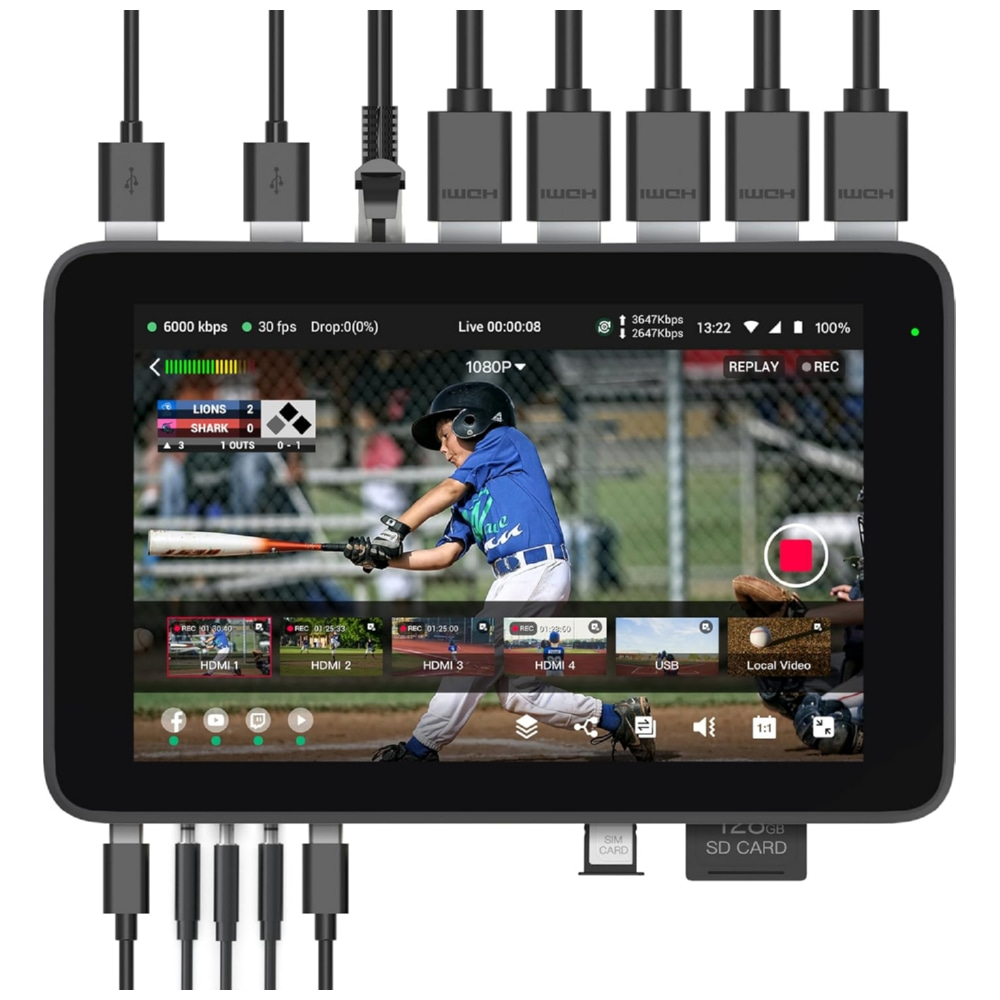 Maak vanaf elke locatie een live stream productie met de YoloBox Ultra van YoloLiv, die functioneert als een draagbare multicamera-encoder, streamer, switcher, monitor en recorder, allemaal in één apparaat. Zend gelijktijdig UHD 4K video streams uit via Wi-Fi 6, RJ45 Ethernet, USB-C modem, of 4G LTE met een SIM-kaart en abonnement. De Ultra beschikt over vier HDMI, één USB-C, en twee USB-A ingangen om te verbinden met meerdere camera's of apparaten. Een geïntegreerde Qualcomm CPU 865 verbetert de prestaties van live streaming en een 650 cd/m² helder LCD-touchscreen verbetert de zichtbaarheid. De Ultra kan tot wel 8 uur achtereen streamen dankzij de ingebouwde 6800mAh batterij.